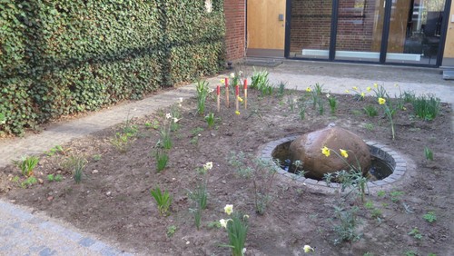 Midt i den nyrenoverede atriumgård stiker 4 rødmalede pinde op af jorden. Hvad laver de mon der? Blev gartnerne ikke helt færdige eller skal der stå 4 små træer? Det bliver da vist for tæt. Mange gode spørgsmål og mange mulige svar. Indtil videre blæser svaret i vinden og alle nysgerrige må væbne sig med tålmodighed.