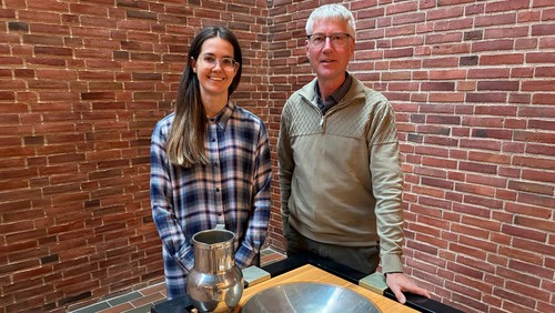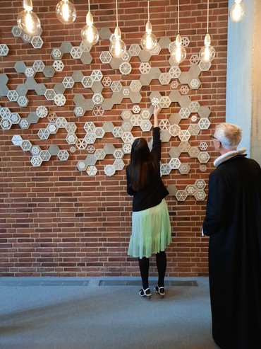 Donna peger på ’Stjernevinge’, som udsmykker væggen i Jakobskirken. ”Her hængte jeg min stjerne op,” viser hun sognepræsten som døbte hende. Kunstværket er interaktivt og nye perleplade-stjerner føjer sig til netværket, når en bliver døbt. ”Det gav mening for mig. Jeg er også sådan en stjerne i Guds store vrimmel.”