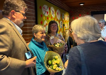 På vegne af menighedsrådet overrakte Lis Nielsen en buket til kunsthåndværkerne Birgit Bylov og Kirsten Lang, som har ledet den kreative proces.