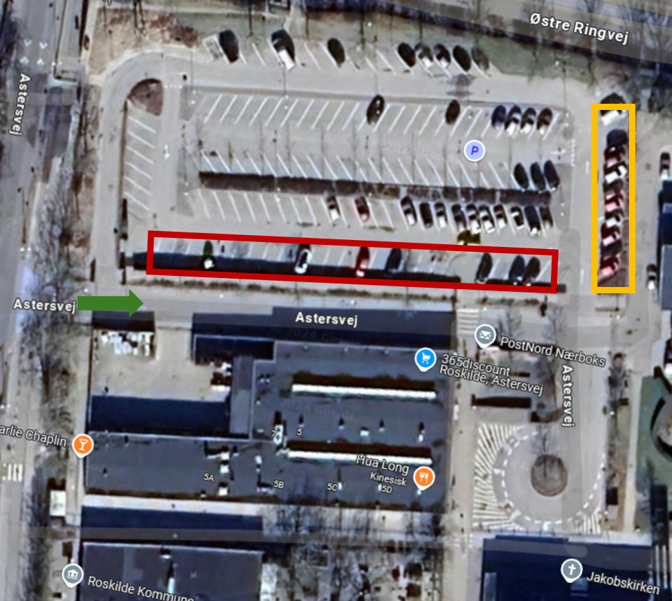 - båsene markeret med gul (kun 3 timer, og de fleste pladser her er forbeholdt el-biler)